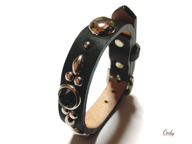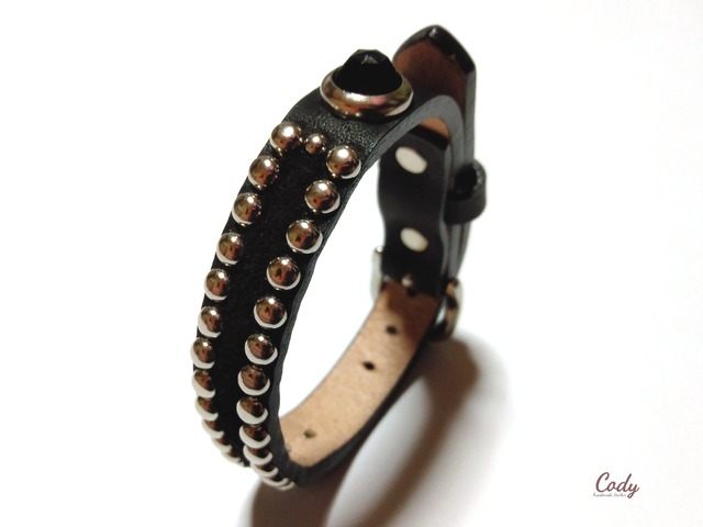 ■15mm スタッズリストバンド。 幅15mmサイズのリストバンドです。 程よいサイズは身に付けやすいので 単体ではもちろん、他のアクセサリーと 重ね付けなど気分にあわせて 楽しめるアイテム。 存在感あるデザインで 手首を飾って頂けます。 ベースとなる革は 厳選したベンズ部位のオイルレザーを仕様。 またレザーは芯通しではなく 芯まで染めていない所謂、茶芯タイプ。 使う度に内側の茶が浮かび上がる独特な 経年変化を感じて頂けます。 サイズは男性サイズ・女性サイズ問わず お使い頂ける5段階調整です。 使用する度に深まるレザーの質感と スタッズの経年変化を是非、楽しんで下さいね。 ■color:黒 スタッズ:NICKEL/ニッケル ジュエル:BLACK/黒 ■size:FREE/ 全長:28.5cm(バックル含む) バックルピンから最小ホールまで17.5cm 最大まで1cm間隔5段階調整。 □こちらは素材のカラーパーツが選択可能です。 画像及びオプションにて お好きなカラーパターンをお選び下さい。 ご依頼頂いてからの受注製作となります。 完成までお時間を頂戴します。 ご注文状況により変動はありますが、 おおよそ2-4週間程度となります。 尚、オプションで選択出来ない細かな箇所の カラーパーツ変更などのご要望は お気軽にdmにてお問合せ下さい。
